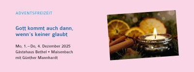 Vom 1. bis 4. Dezember 2025 findet unsere Adventsfreizeit mit Günther Mannhardt statt. »Gott kommt auch dann, wenn’s keiner glaubt« – Advent bedeutet nicht nur einen Blick zurück auf... Weiterlesen