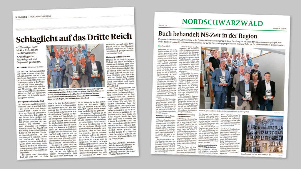 Der siebte Band der »Edition Papierblatt« mit dem Titel »Der Kreis Calw in der Zeit des Nationalsozialismus« wurde von Gabriel Stängle aus Nagold und Schuldekan Thorsten Trautwein herausgegeben und am 16. Juli im Landratsamt Calw gemeinsam mit Förderern und Autoren der Presse vorgestellt. Inzwischen haben die Pforzheimer Zeitung und der Schwarzwälder Bote ausführlich über die Neuerscheinung berichtet, die neben den Schicksalen von Opfern auch die Entstehung und Etablierung der NSDAP sowie ihre Leitungsstrukturen in unserer Region darstellt.