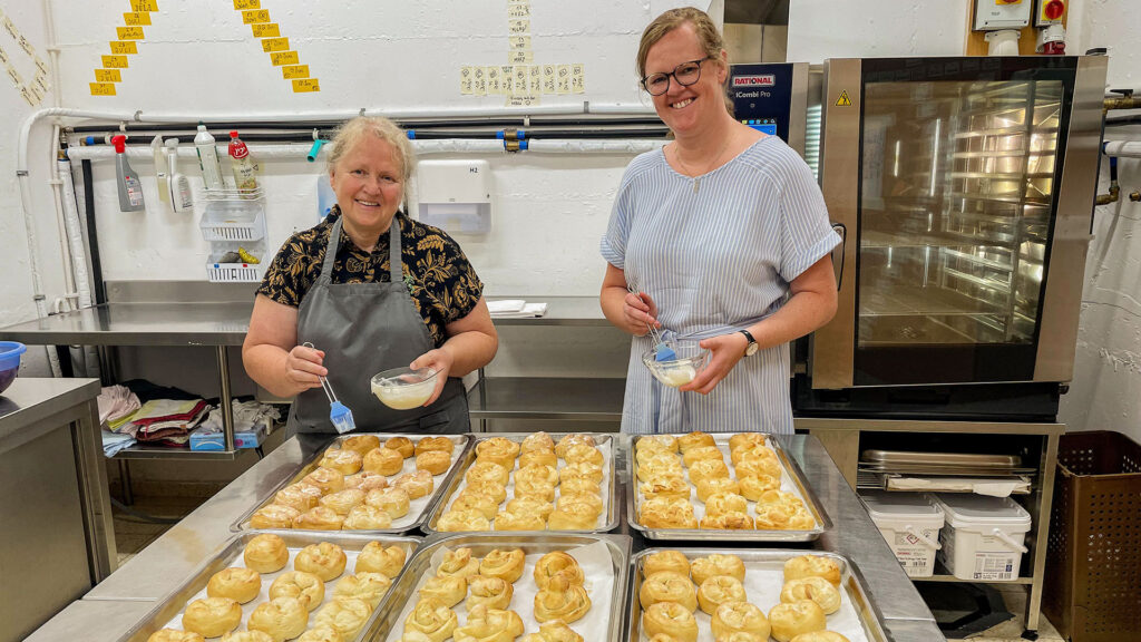 Mich bewegt es sehr, dass wir auch in dieser Situation was zum Danken finden können: Unsere Großküche war nach dem Bunkerauszug unten geblieben, da die neue Küche noch mit manchem ausgestattet werden musste. So können wir in der Struktur weiterarbeiten, die wir schon seit fast zwei Jahren kennen und optimiert haben. Neu ist, dass wir aufgrund der Sprengkraft der iranischen Raketen bei Alarm nicht weiterarbeiten können, sondern die Zeit bis zur Entwarnung im Pflegebunker abwarten müssen. Wenn ich Bilder und Videos sehe von Menschen, die in Tel Aviv oder Jerusalem die Nächte in U-Bahnstationen verbringen, um sicher zu sein, bin ich dankbar, dass wir unseren eigenen, gut ausgestatteten Bunker haben. Trotz aller Enge sind wir sehr privilegiert.