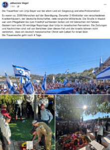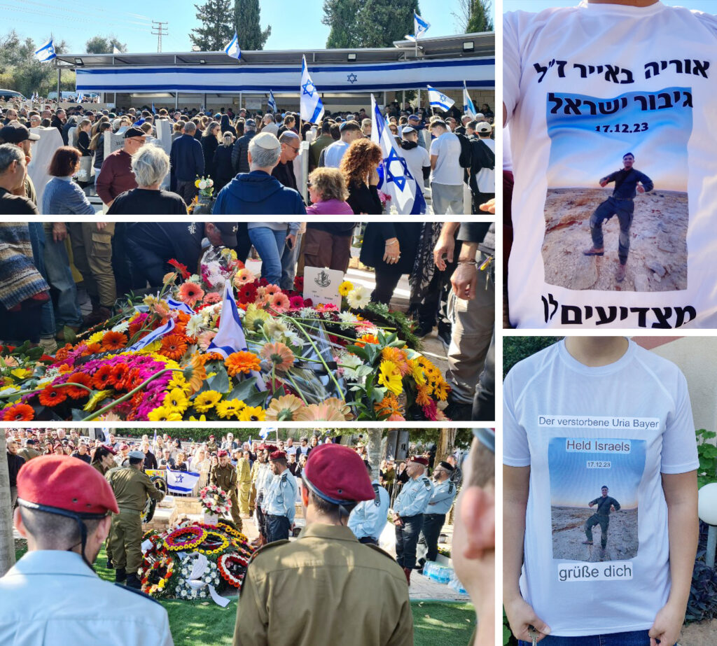 Die Trauerfeier von Urija Bayer war bei allem Leid ein Siegeszug und eine Proklamation! Es waren ca. 2000 Menschen auf der Beerdigung. Darunter 3 Klinikleiter von verschiedenen Krankenhäusern, der deutsche Botschafter, viele ranghohe Militärleute. Die Straße in Maalot war vom Pflegeheim bis zum Friedhof auf beiden Seiten voll mit Menschen mit Fahnen. Gestern kam eine 30 minütige Reportage über Urija im israelischen Fernsehen. Die Zeitungen und Nachrichten sind voll von Berichten über diesen Fall und die Israelis können nicht verstehen, dass ein deutsch messianischer Christ sein Leben für Israel lässt. Die Trauerwoche geht noch 4 Tage.