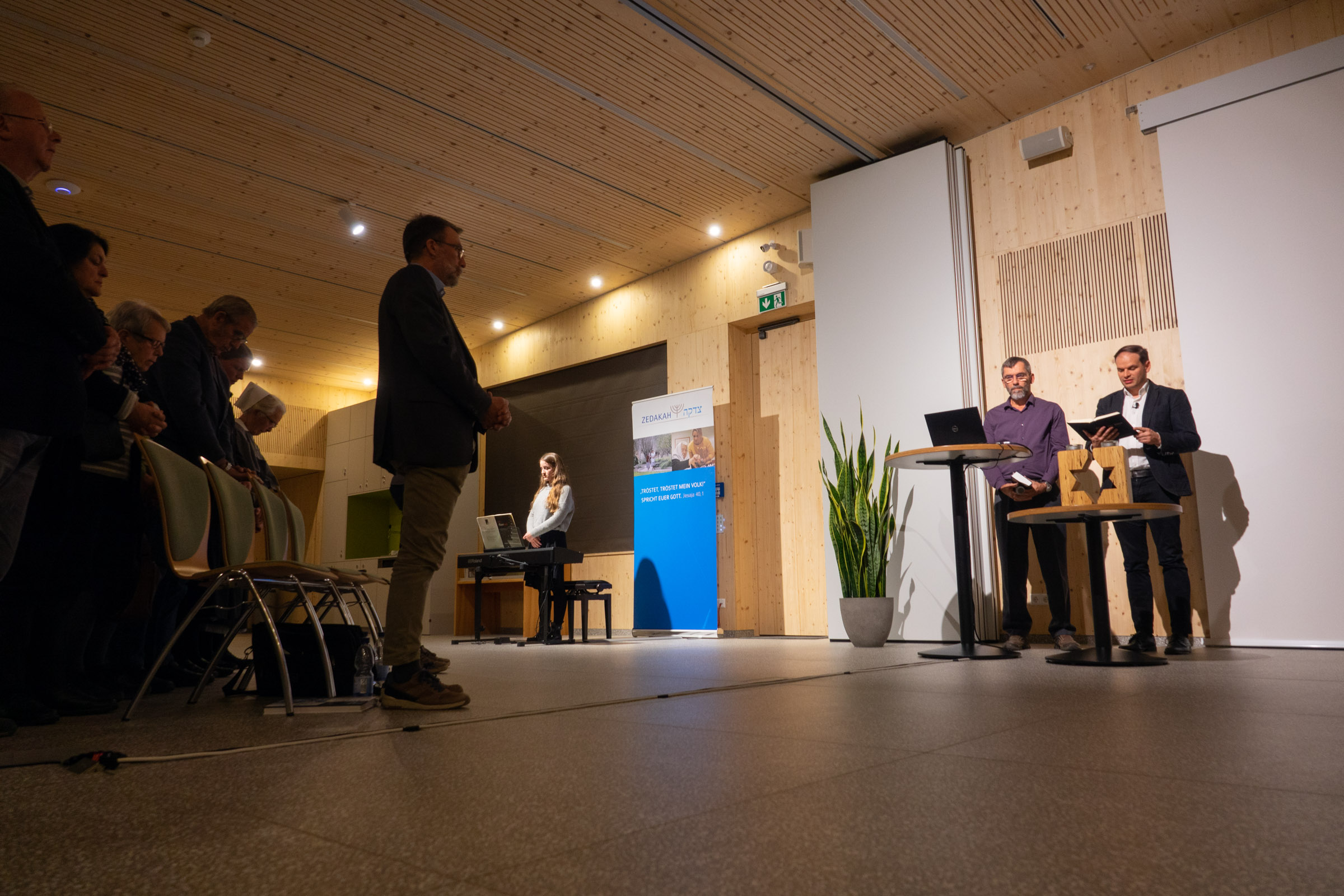 Zum Gedenken an die jüdischen Opfer der Reichspogromnacht und des Holocaust zündeten Frank Clesle und Schmuel Bayer zwei Kerzen an und lasen auf deutsch und hebräisch Psalm 74 vor, dessen Worte sich am 9. November 1938 – etwa 3000 Jahre nach seiner Abfassung – nahezu wortwörtlich zugetragen haben: »Sie verbrennen dein Heiligtum, bis auf den Grund entweihen sie die Wohnung deines Namens. Sie sprechen in ihrem Herzen: Lasst uns sie allesamt unterdrücken! Sie verbrennen alle Gotteshäuser im Lande.«