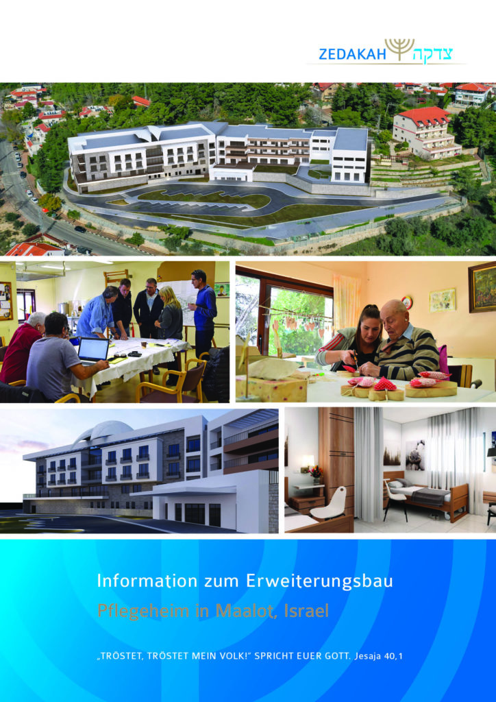 Zedakah betreibt in Israel das in seiner Art einzige Pflegeheim von Christen aus Deutschland, welches vom israelischen Gesundheitsministerium als Krankenhaus für Geriatrie anerkannt ist. Hier werden seit 1984 hilfsbedürftige Juden, die den Holocaust überlebt haben, gepflegt und umsorgt. Dafür sendet Zedakah deutschsprachige Fachkräfte und Volontäre aus, die als entschiedene Christen mit ihrem Dienst der Liebe ein Zeugnis für den wahren Trost Israels sein wollen. Für die 24 sehr begehrten Pflegeplätze gibt es eine lange Warteliste. Das bewegt uns seit Jahren!