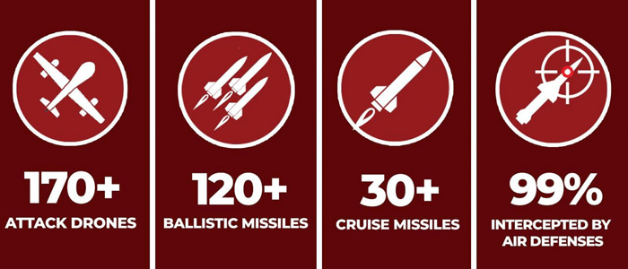 Nach und nach ist zu erfahren: Im Lauf der Nacht wurden 185 Kampfdrohnen und 36 Marschflugkörper nach Israel abgefeuert, von denen durch rechtzeitigen Abschuss KEINE das israelische Staatsgebiet erreichte. Darüber hinaus kamen 110 ballistische Raketen und Dutzende Raketen aus dem Libanon, Irak und Jemen, die zu 99% abgeschossen werden konnten. Ein Mädchen wurde durch Raketensplitter schwer verletzt; der entstandene Sachschaden ist gering.