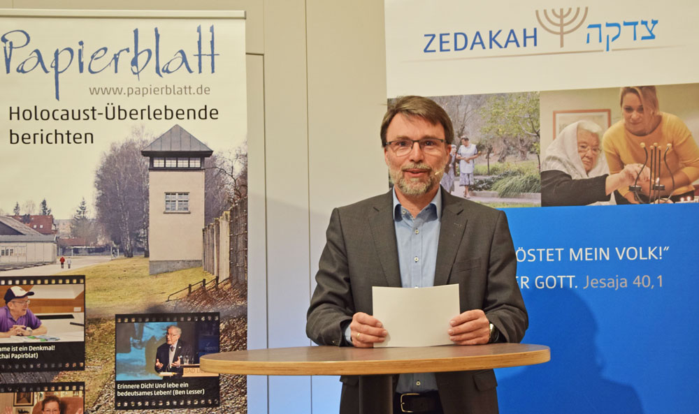 Über Zoom waren Mordechai Papirblat, sein Sohn Shlomo aus Costa Rica und Gideon Bayer, unser Mitarbeiter aus Israel als Übersetzer dabei. Leider gab es Schwierigkeiten mit der Übertragung, so dass wir bedauerlicherweise das Zoomgespräch abbrechen mussten. Torsten Trautwein, der bei der Überarbeitung der Geschichte von Mordechai Papirblat „900 Tage in Auschwitz“ mitgewirkt hatte, füllte diese Lücke dann mit einigen Bildern und dem mündlichen Bericht über die Lebensgeschichte von Mordechai.