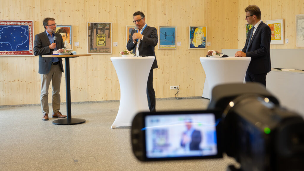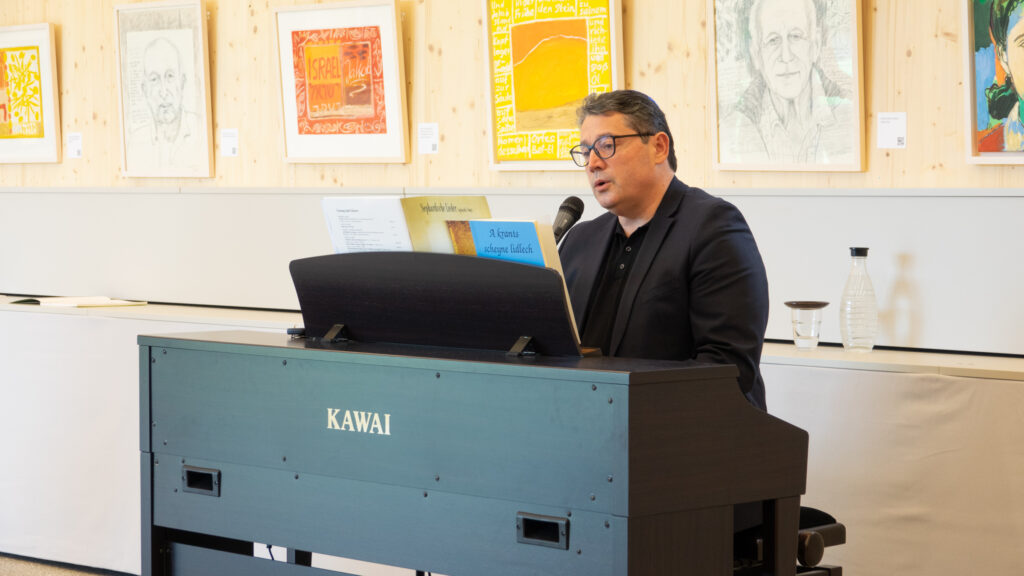 Die Eröffnungsfeier endete mit der Vernissage der ersten Kunstausstellung, die nun bis zum 21.10.2021 in den iP-Räumlichkeiten zu sehen sein wird. Die Malerin Marlis Glaser übergab dem iP-Zentrum zwei Bilder, die speziell für Zedakah und die Gedenkarbeit gemalt wurden: ein Porträt von Mordechai Papirblat, dem 98-jährigen Namensgeber des Projekts »Papierblatt« – und ein Gemälde mit Bäumen, die sein eindrucksvolles Leben repräsentieren, das von 900 Tagen in Auschwitz geprägt wurde. »Sein Name ist ein Denkmal«, sagte Schuldekan Thorsten Trautwein.