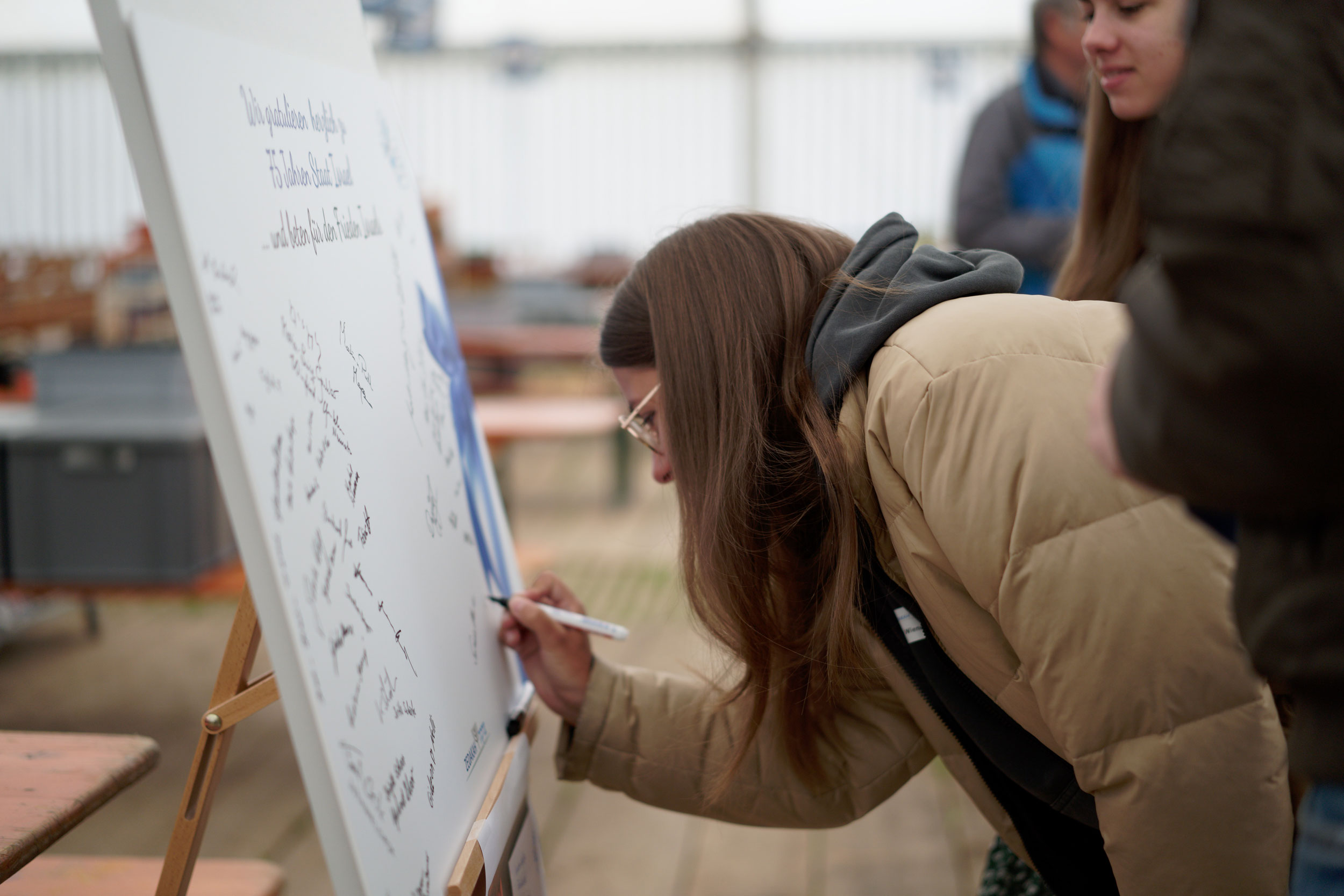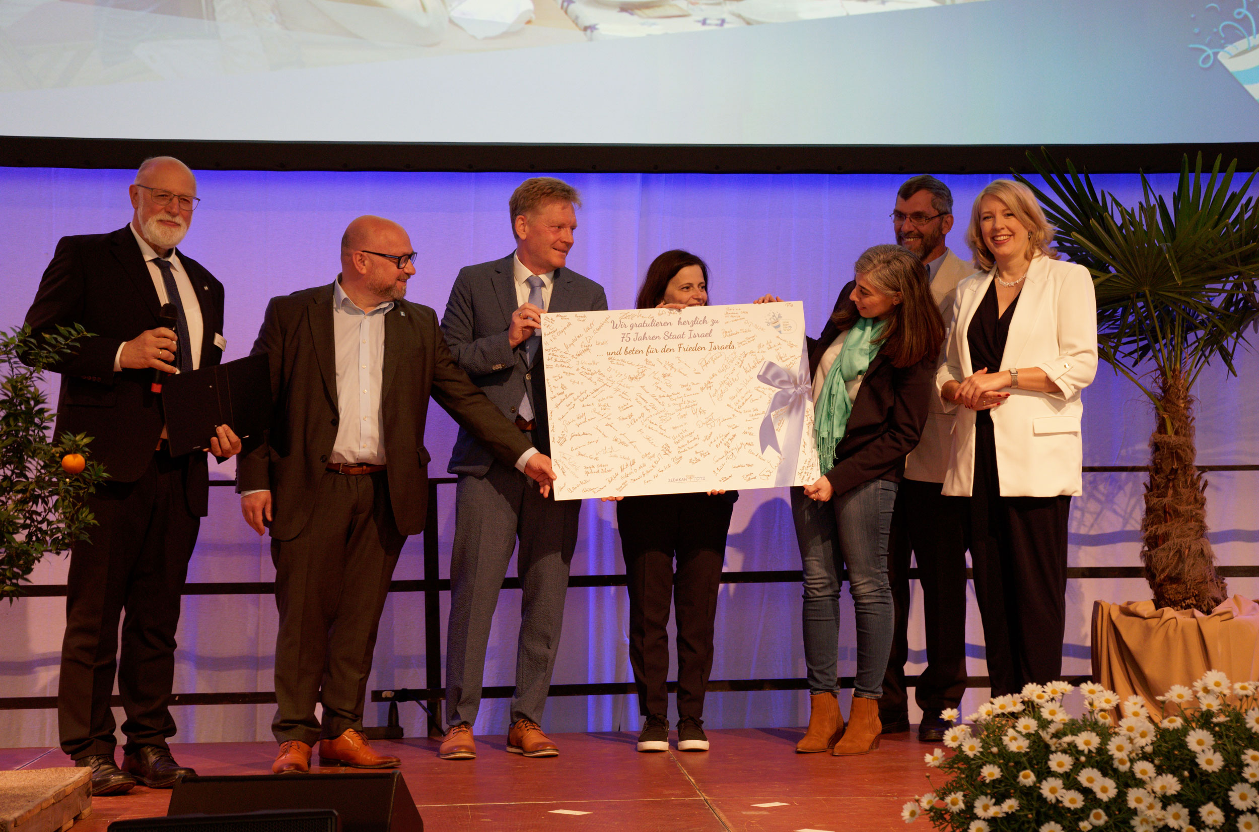 Die Besucher konnten sich auf einer Großformatkarte mit ihrer Unterschrift an den Glückwünschen für Israel beteiligen. Die Glückwunschkarte wird der Generalkonsulin des Staates Israel feierlich überreicht.
