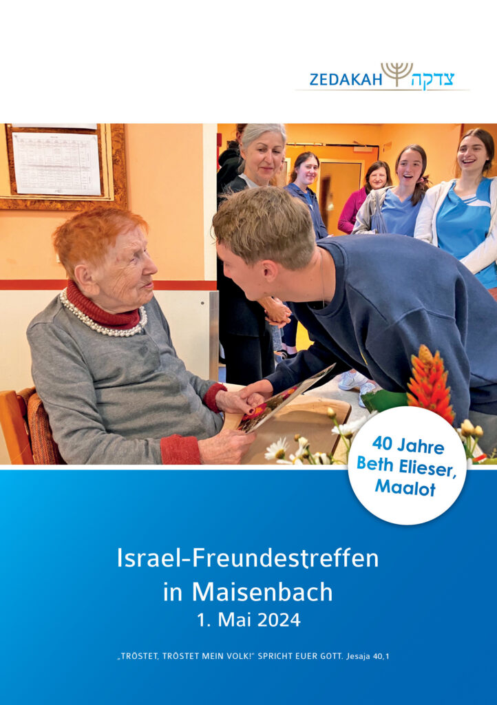 Wir laden Sie herzlich ein, am 1. Mai 2024 bei unserem Israel-Freundestreffen dabei zu sein. Wir möchten gerne mit Ihnen das 40-jährige Jubiläum unseres Pflegeheims Beth Elieser in Maalot feiern und gemeinsam über Gottes Plan mit Israel nachdenken. Dazu wird Johannes Pflaum zwei Botschaften bringen mit dem Thema: „Warum gibt es so viel Hass gegen Israel?“ und „Betet für den Frieden Jerusalems!“. Außerdem nehmen wir Sie mit in aktuelle Themen aus Israel und aus unserer Arbeit.
