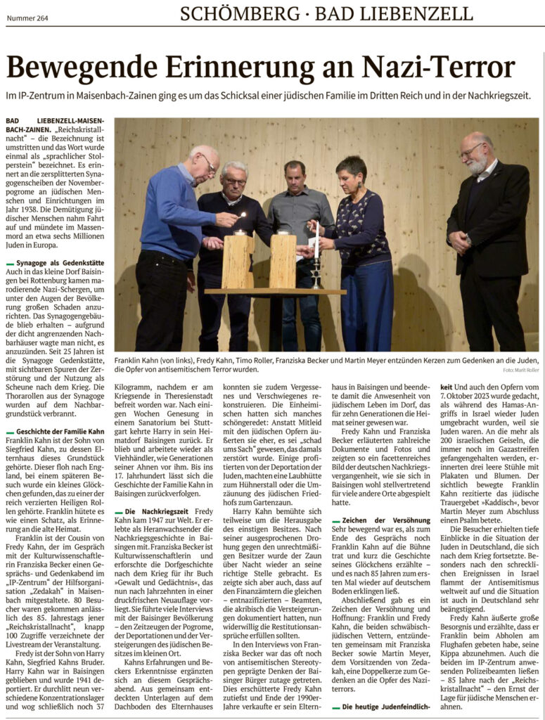 Franklin ist der Cousin von Fredy Kahn, der im Gespräch mit der Kulturwissenschaftlerin Franziska Becker einen Gesprächs- und Gedenkabend im »IP-Zentrum« der Hilfsorganisation »Zedakah« in Maisenbach mitgestaltete. 80 Besucher waren gekommen anlässlich des 85sten Jahrestags jener »Reichskristallnacht«, knapp 100 Zugriffe verzeichnete zudem der Livestream der Veranstaltung.
