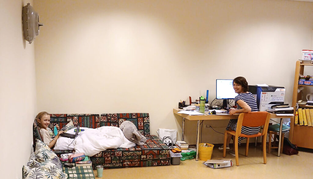 Da Schule und Kindergarten in Nordisrael seit Sonntag im Onlinemodus laufen, wird mein Schutzraumbüro auch als Zoom-Klassenzimmer benutzt. Bei Alarm in Shavei Zion (und unmittelbarer Umgebung) kommen auch die anderen Hausbewohner für den geforderten Zeitraum dazu.