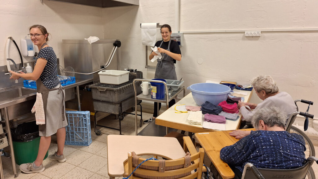 Ich habe das Gefühl, ich bin gut reingekommen und auch eine Hilfe. Es ist gut, eine Aufgabe zu haben. Auch wenn alles sehr eng ist, ist es doch schön, mit den Heimbewohnern und Stationsmitarbeitern engeren Kontakt zu haben und von deren Alltag etwas mitzubekommen. Manchmal habe ich etwas Angst, dass das Konfliktpotenzial steigt, wenn wir uns so auf den Füßen stehen, aber noch geht es sehr gut.