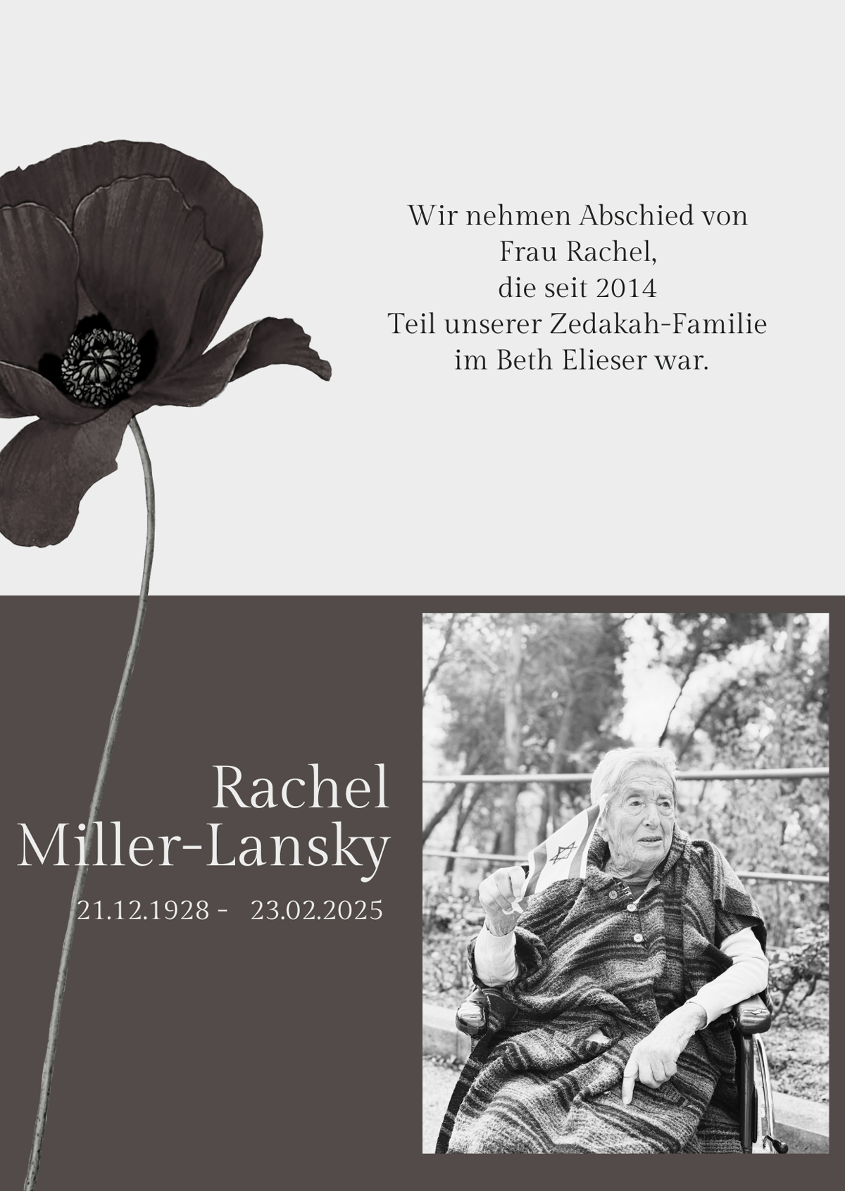 Wir nehmen Abschied von unserer Frau Rachel, die seit 2014 Teil unserer Zedakah-Familie im Beth Elieser in Maalot war. Nachfolgend noch ein paar Fotos von ihr, von Rachel Miller-Lansky, 21. Dezember 1928 bis 23. Februar 2025.