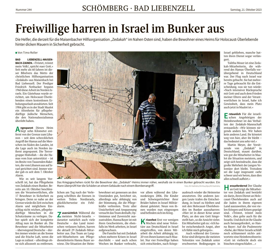Der Schwarzwälder Bote hat in der Calwer Regionalausgabe einen ausführlichen Artikel veröffentlicht über unsere Arbeit in Maalot: »Freiwillige harren in Israel im Bunker aus«. Timo Roller, Autor des Artikels, merkt dazu an: »Das Foto zum Artikel hat die Redaktion ausgewählt. Ich finde es äußerst unpassend, zumal ich zwei Bilder von Zedakah mitgeliefert hatte, die authentisch waren und hätten genutzt werden können. Das abgebildete Foto zeigt laut Google-Bildersuche die Folgen eines Bombeneinschlags auf libanesischer Seite, diese Täter-Opfer-Umkehr hätte die Redaktion sich an dieser Stelle sparen können!«